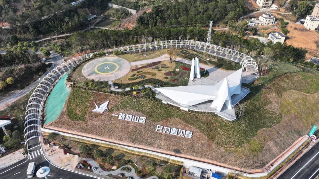 停车区全新增设爱情主题场地,寓意“一心一意”的爱情鸟主构筑物千纸鹤雕塑耸立山顶,搭配“最爱李”户外休闲区,为情侣游客提供专属浪漫休憩空间。还通过暗藏“我爱你一生一世”含义的520玻璃索桥与信宜三华李度假区无缝衔接,开业后将成为情侣打卡的核心地标、全国首个“高速爱情圣地”。