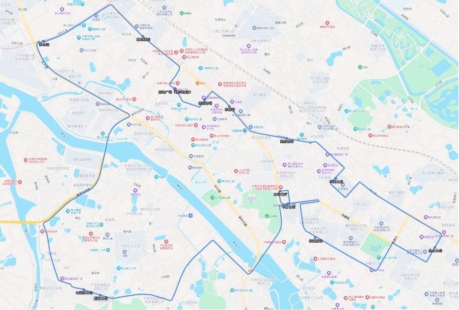 线路站点:地铁2号线茶山站、腾龙酒店、龙珠广场(德兴渔港)、茶园商场、乐融荟、莞府腊味、华美食品、依歌服饰、圣心食品、卡曼食品、太兴餐厅、新盟食品、食滋源食品。